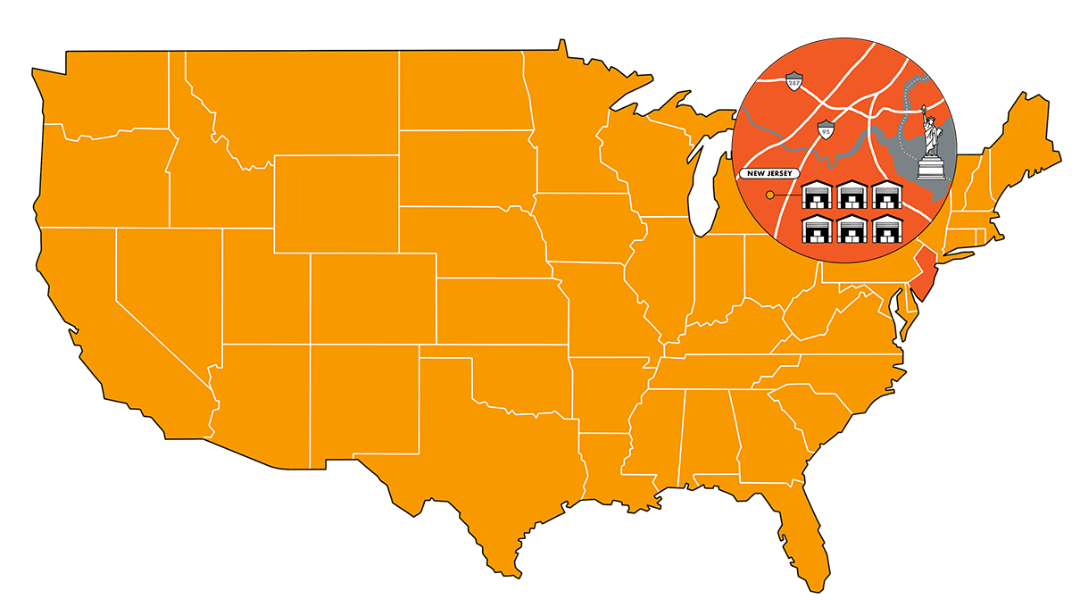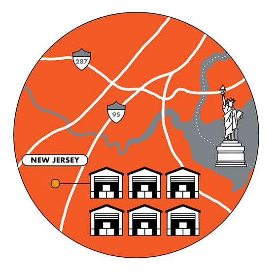 Our New Jersey campus is where we started. We are located within the commercial zone, just south of New York City. Our New Jersey warehouses are situated close to our numerous NYC-based brands. Our strategic location and established partnerships with key carriers allow for reduced transit times with cost-effective shipping and transportation solutions.